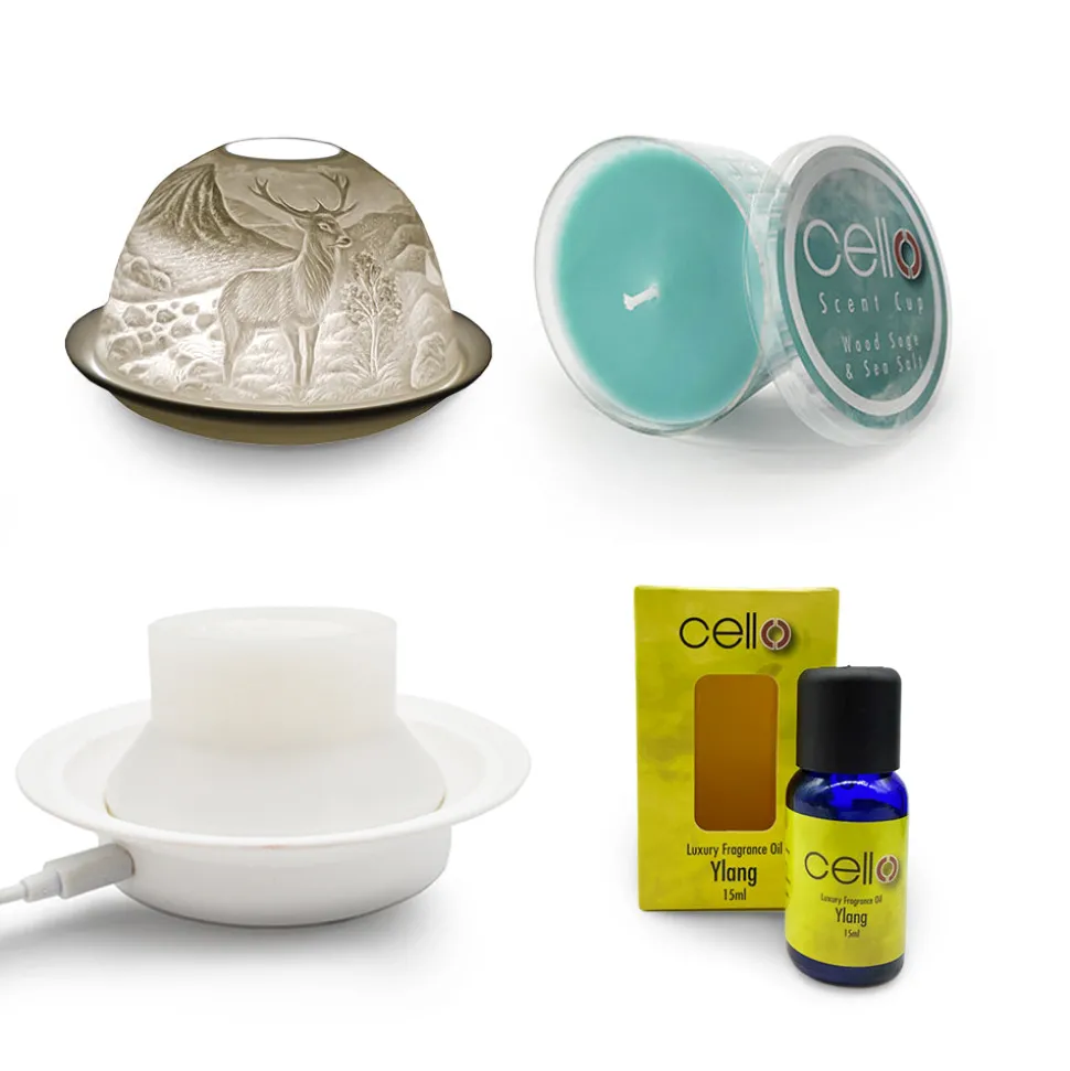This bundle includes 1x Highland Stag Dome, 1x Colour-Changing Aroma Fan Base, 1x Ylang Fragrance Oil, and 1x Wood Sage & Sea Salt Scent Cup.