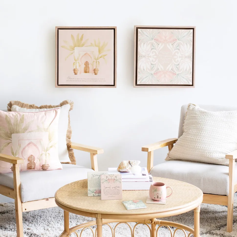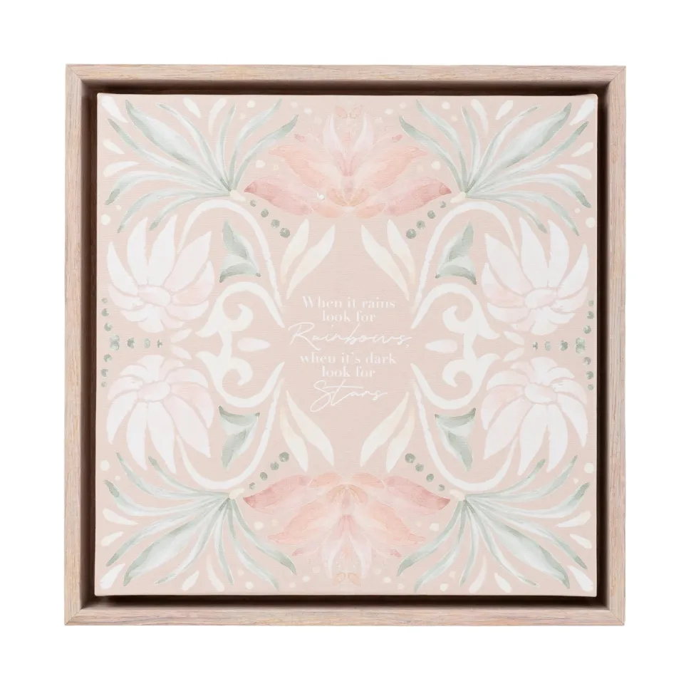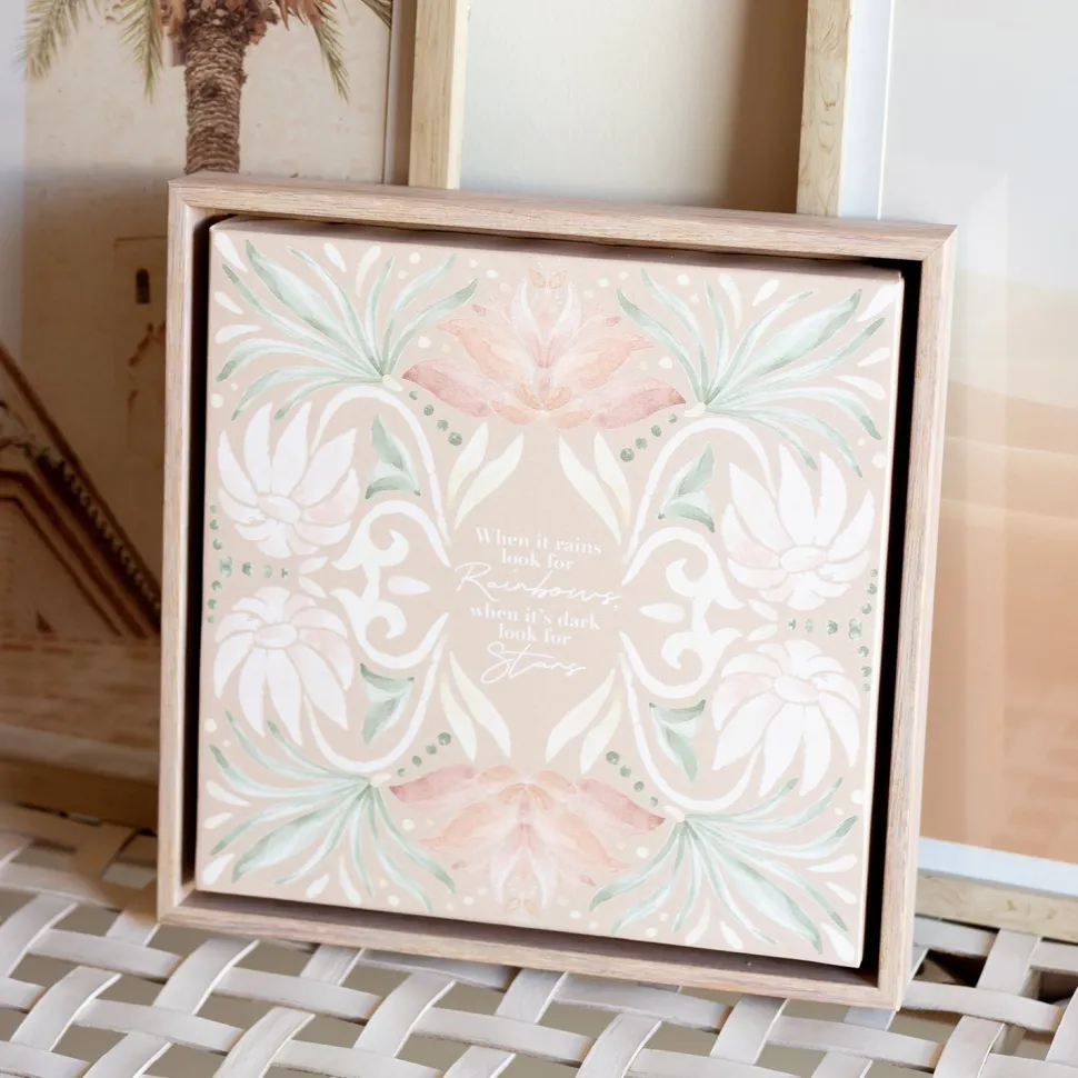 Splosh Modern Oasis Rainbow Wood Look Framed Canvas 34×34, featuring a stunning home print, heartfelt verse, and convenient hooks for easy hanging.