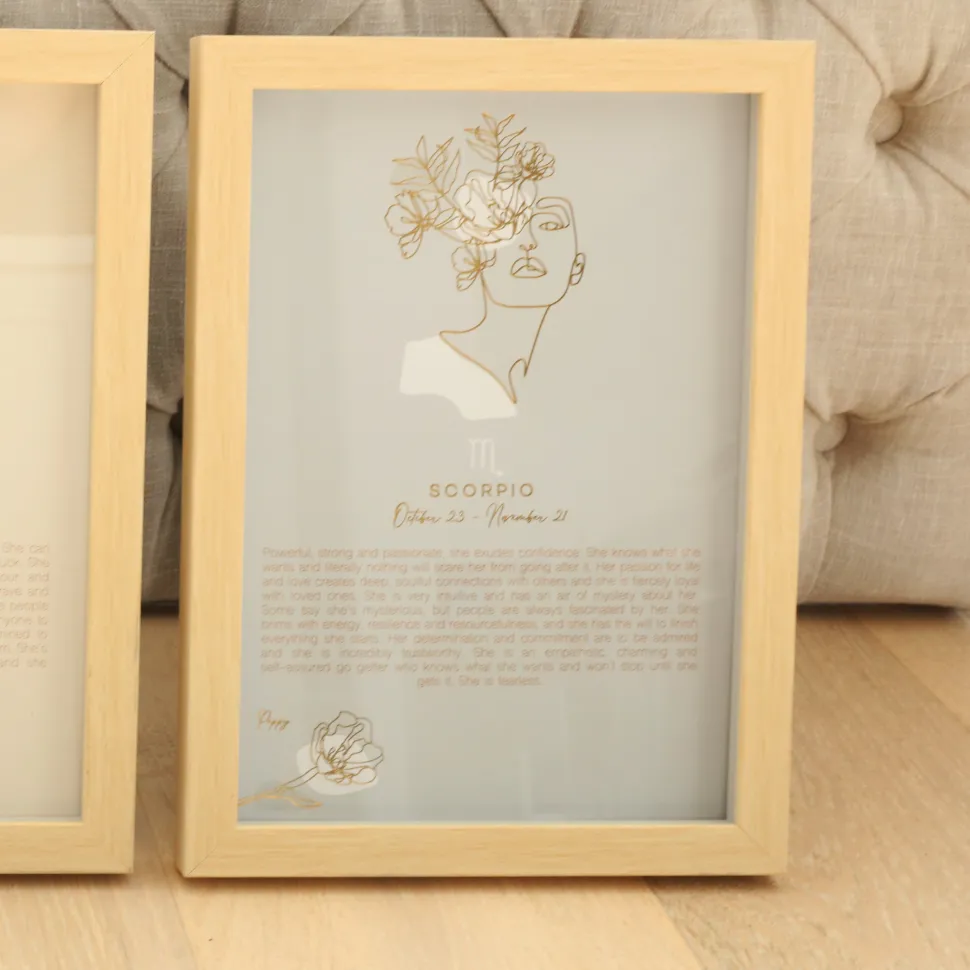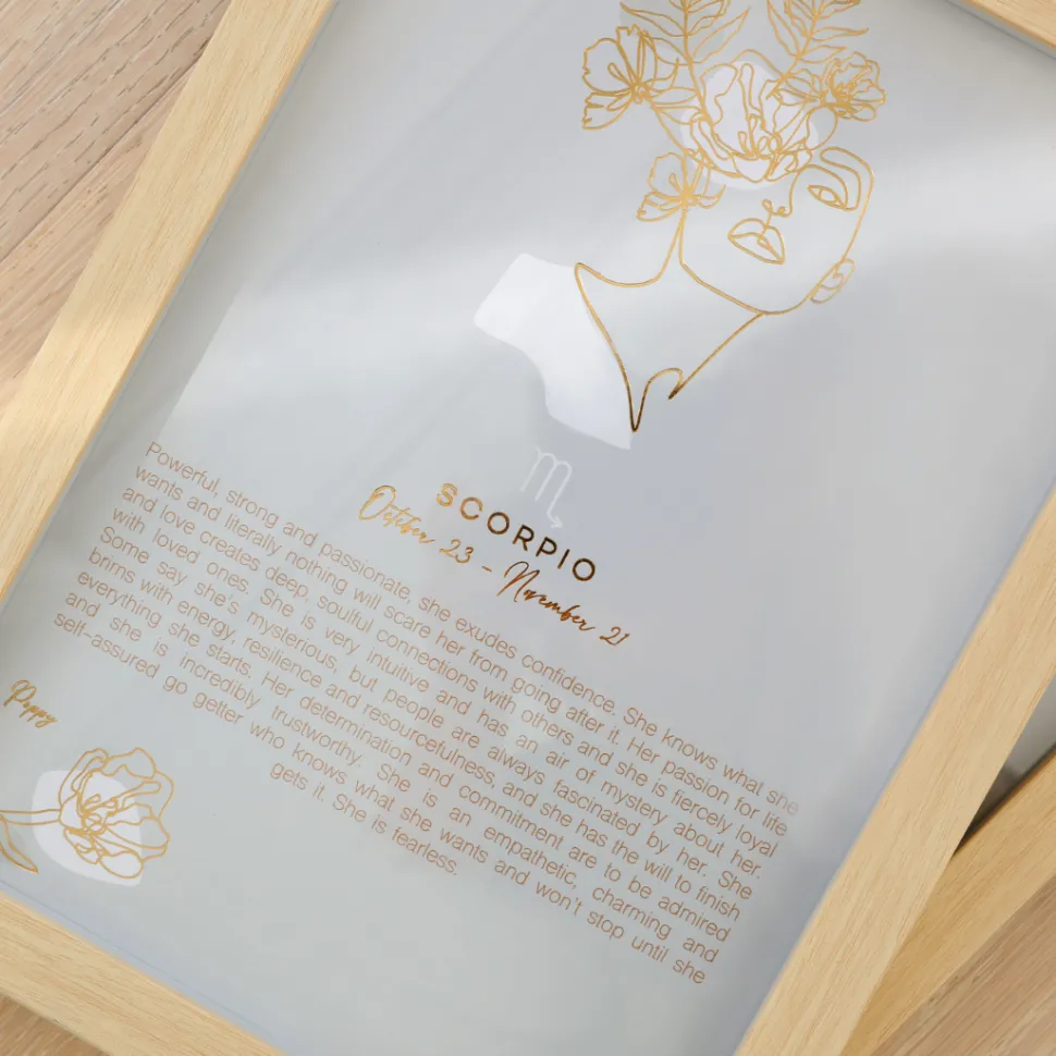 The Mystique Collection features whimsical and feminine illustrations combined with a pastel colour pallet. The collection features 12x framed prints with character profiles for each astrological star sign and gold foil detail for an elegant finished look. Positive and playful, the Mystique Collection offers the perfect personalised gift solution.